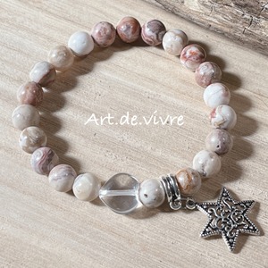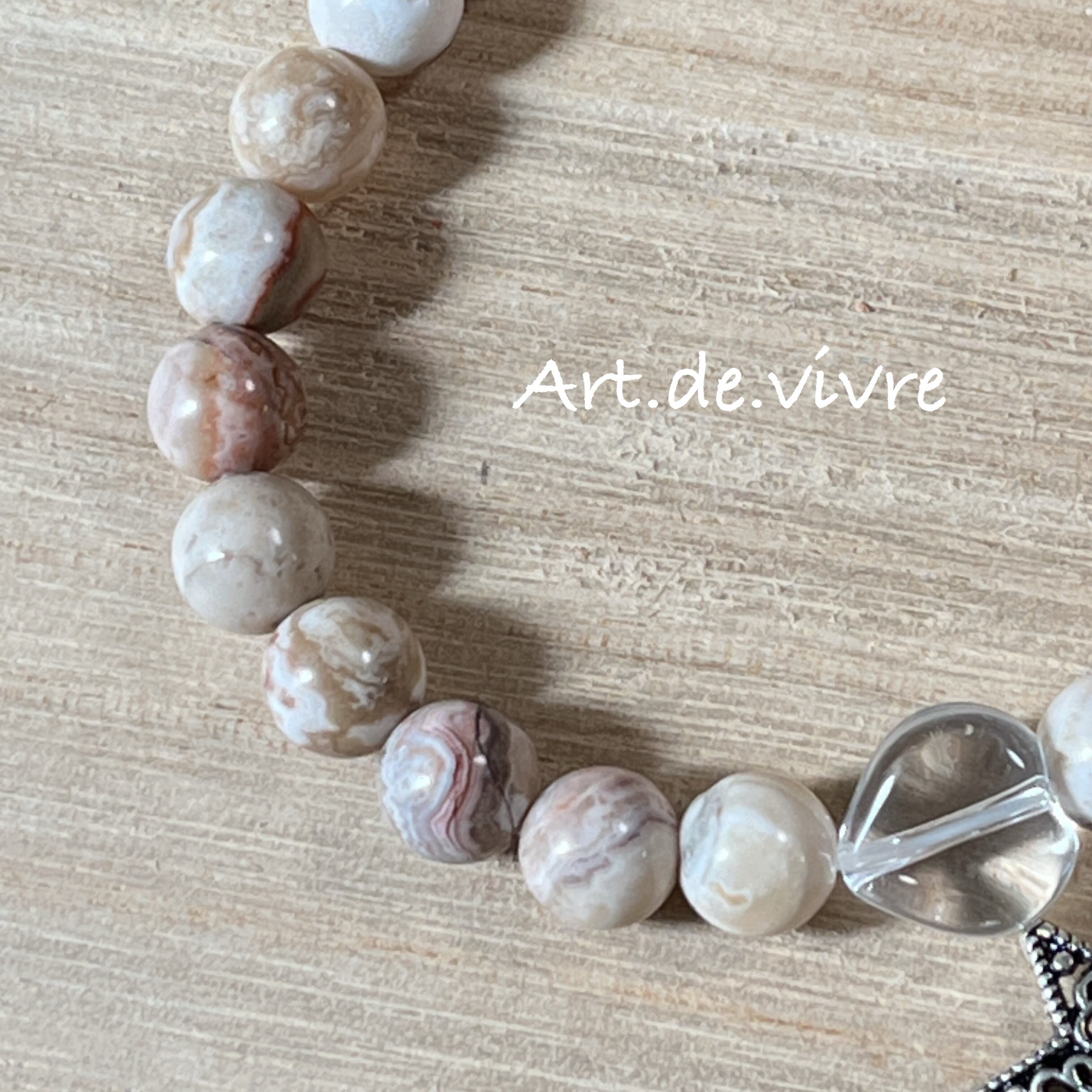 個性的な瑪瑙の文様の『メキシコ産 クレイジーアゲート(クレイジーレースアゲート)』にハートの水晶がアクセントの大人可愛いブレスレット。