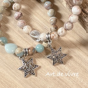 また、アクセントにあしらったハートのミルキーカラーのアマゾナイトとシルバーのチャームが大人可愛いおすすめのブレスレットです。