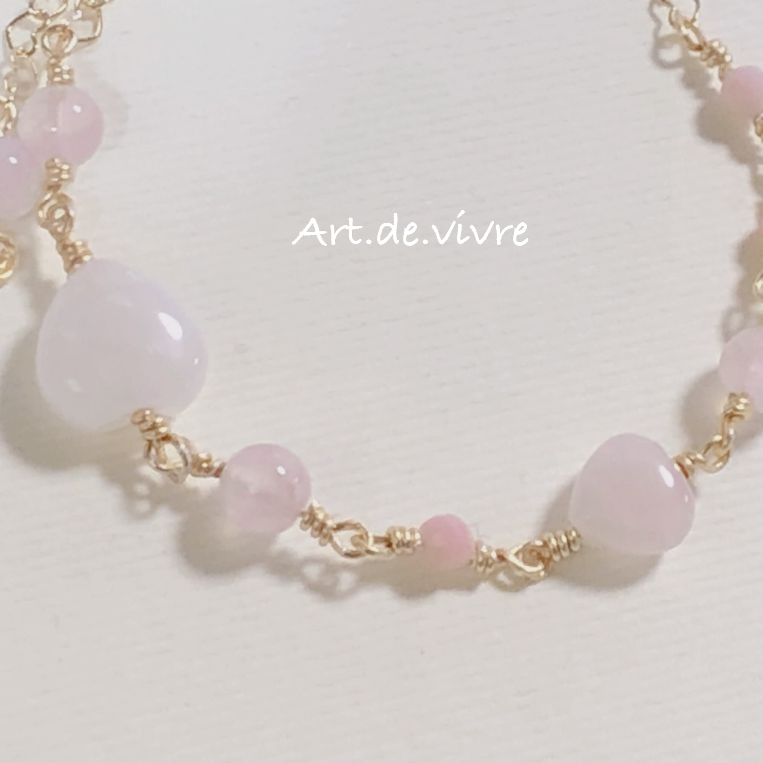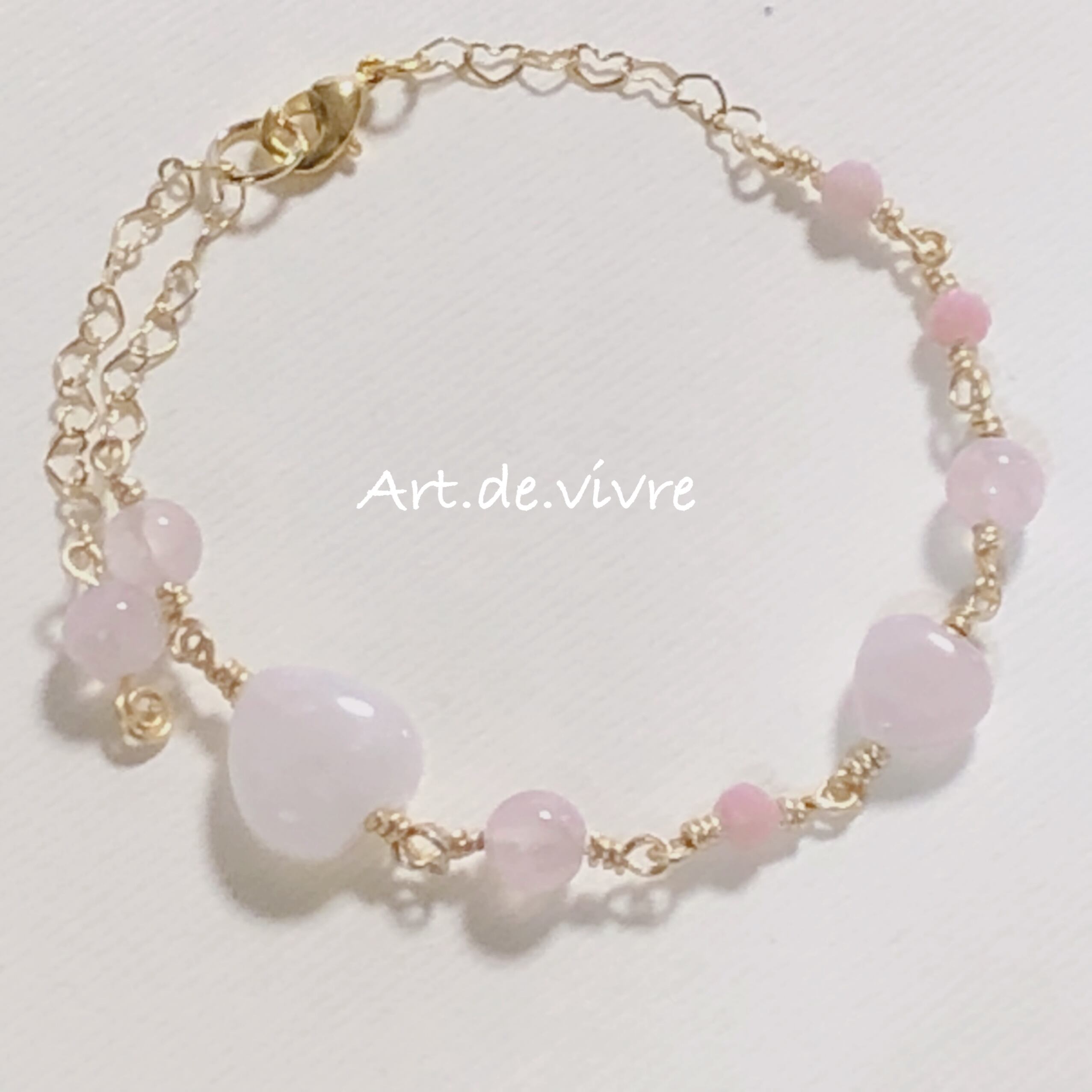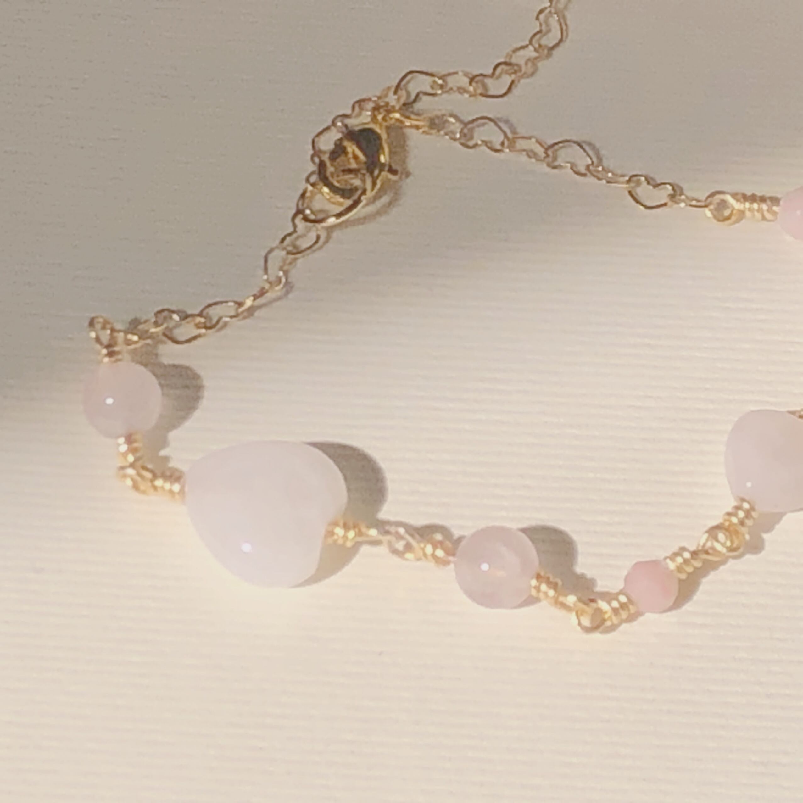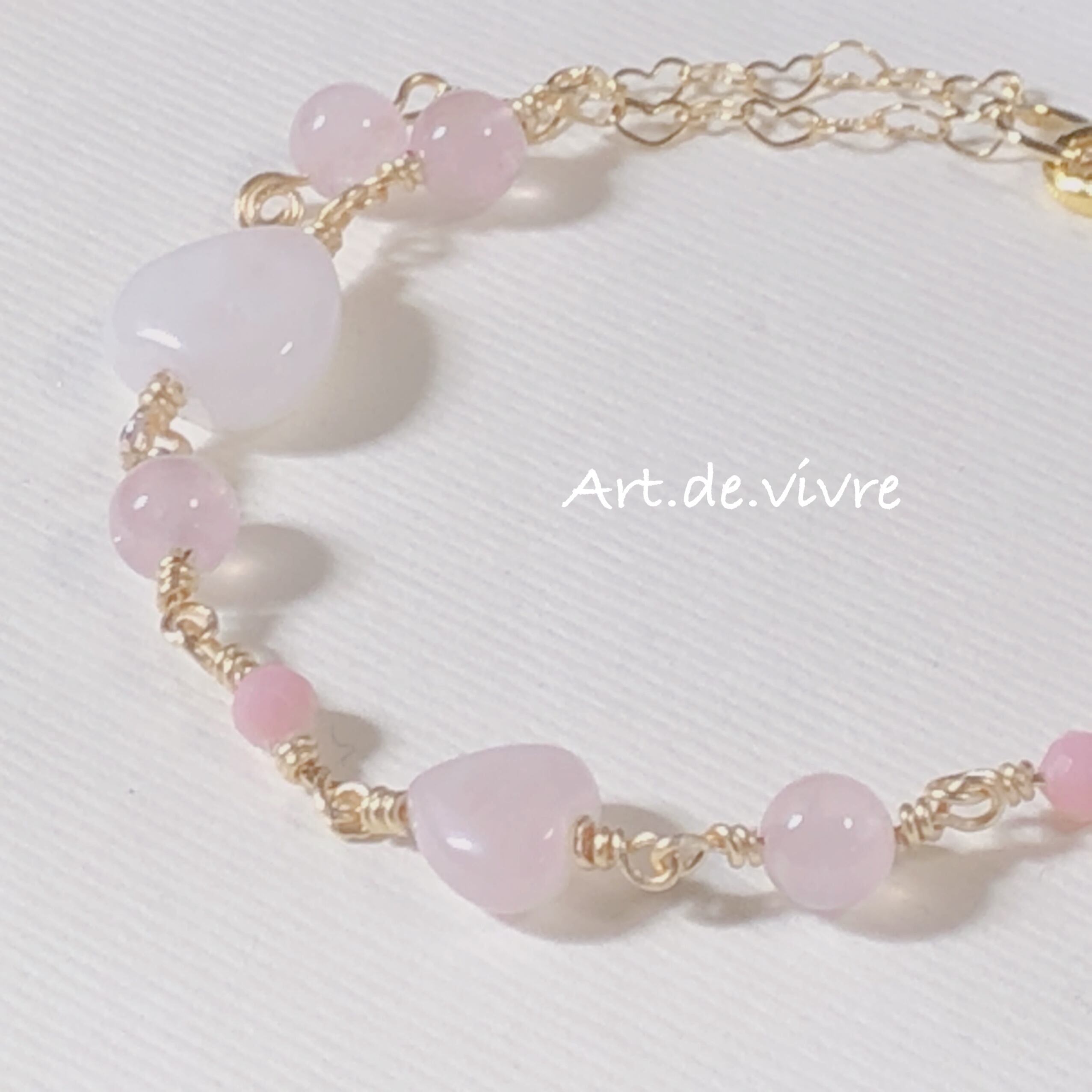 ミルキーピンクの癒しのハートローズクォーツとハートのゴールドチェーンブレスレット