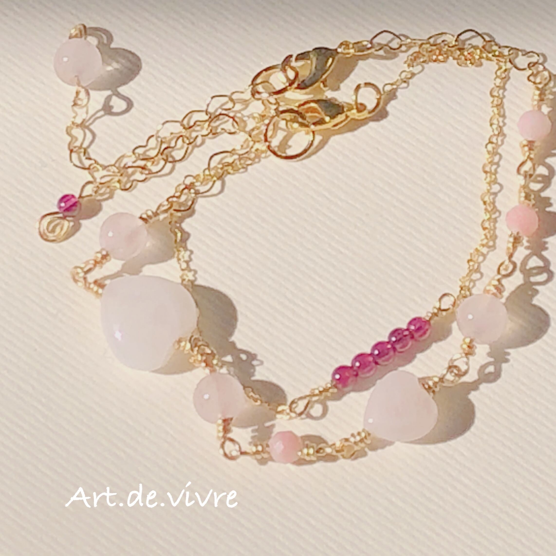 愛らしい「ローズクォーツ」の大小のぷっくりハートがとってもキュートで癒し度満点の天然石ブレスレット!!
