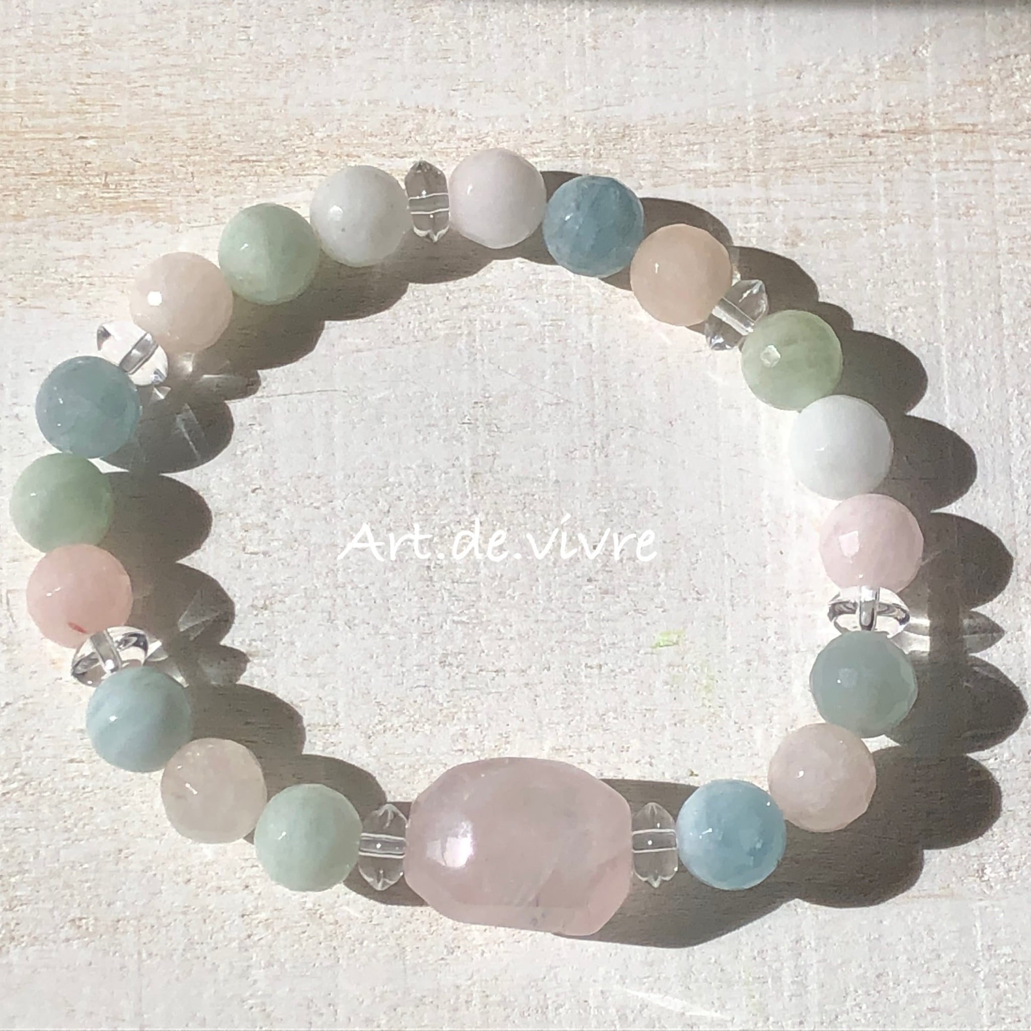 大粒のタンブルカットのローズクォーツと128面カットの華やかなパステルカラーの色合いが美しいモルガナイト(ミックス)の唯一無二の天然石ブレスレット。