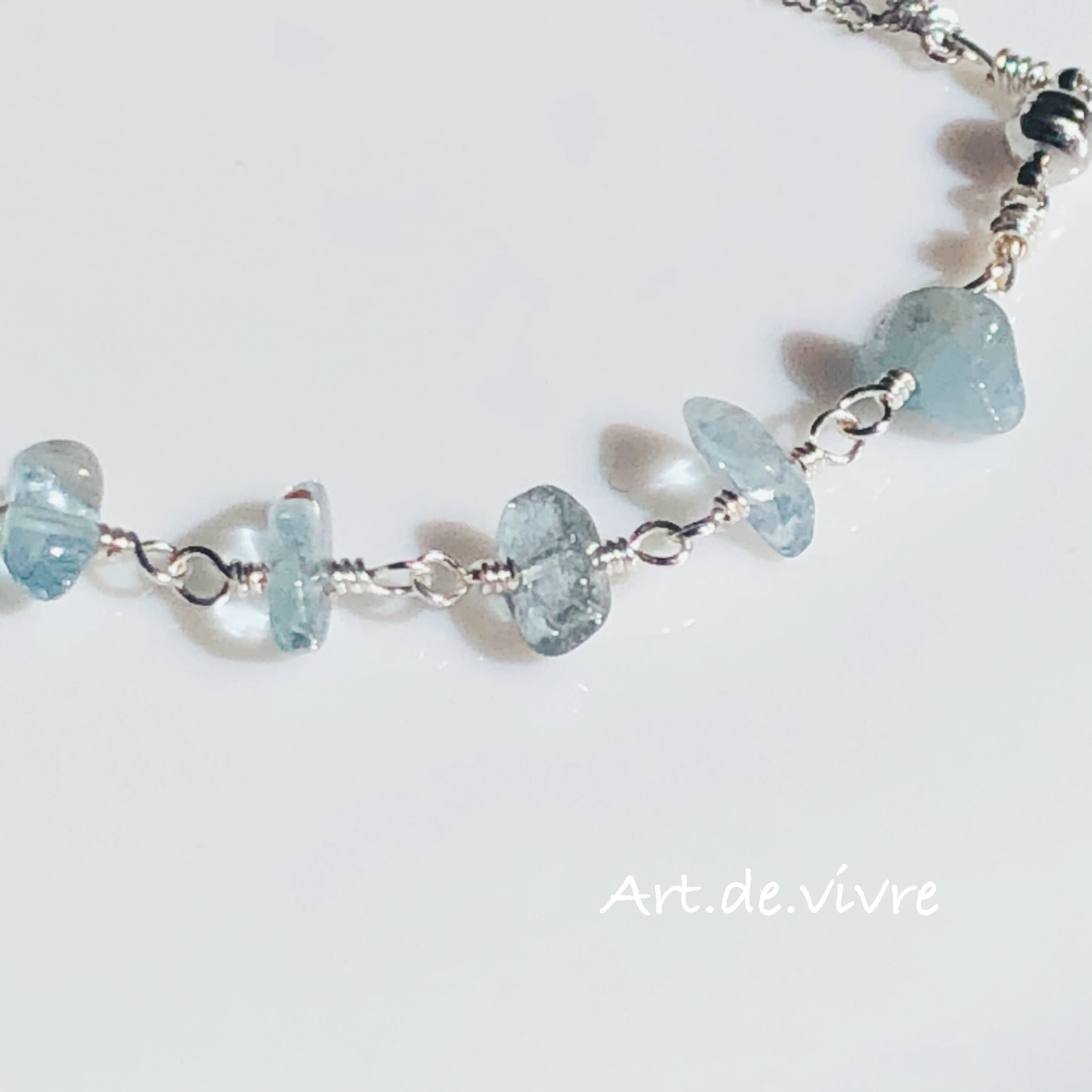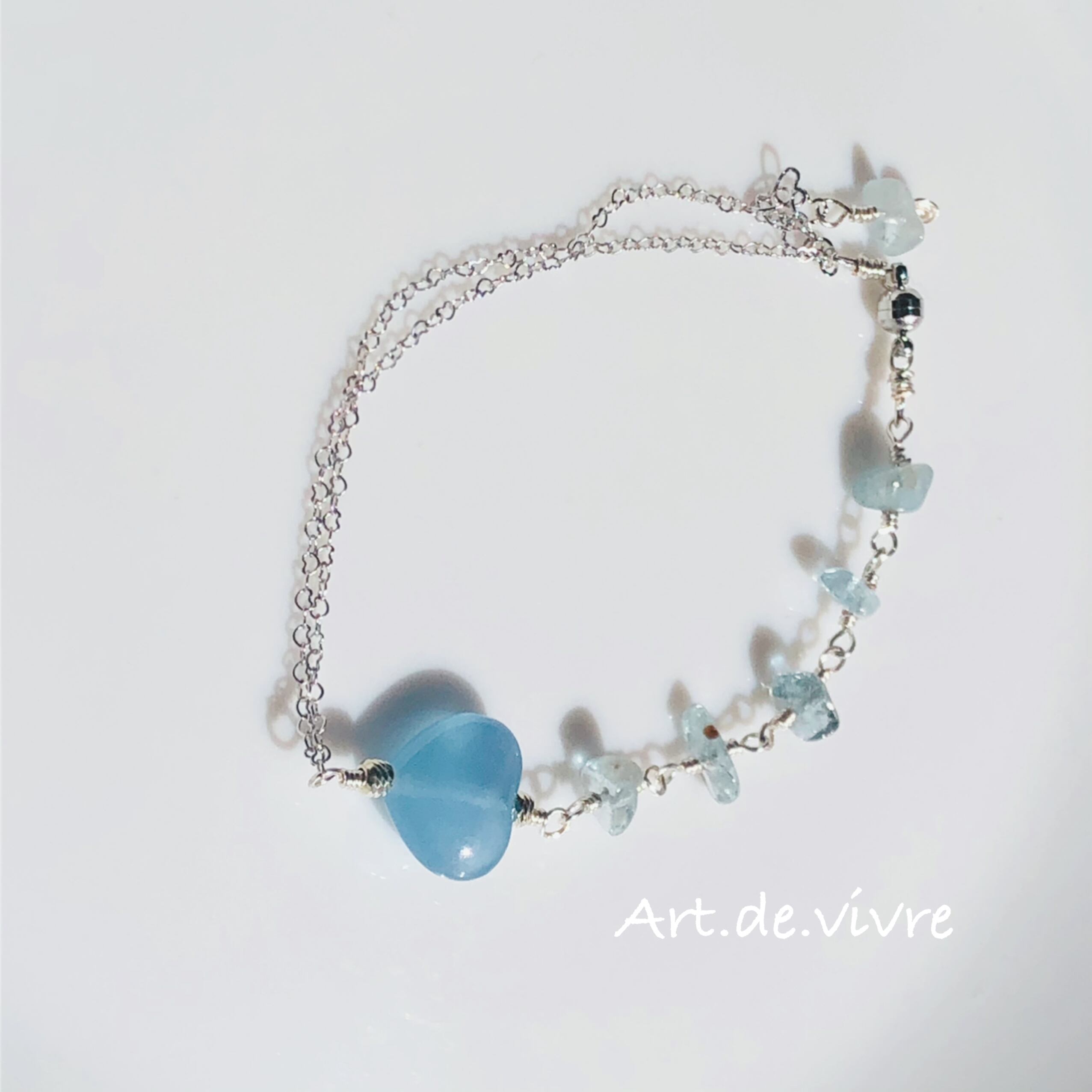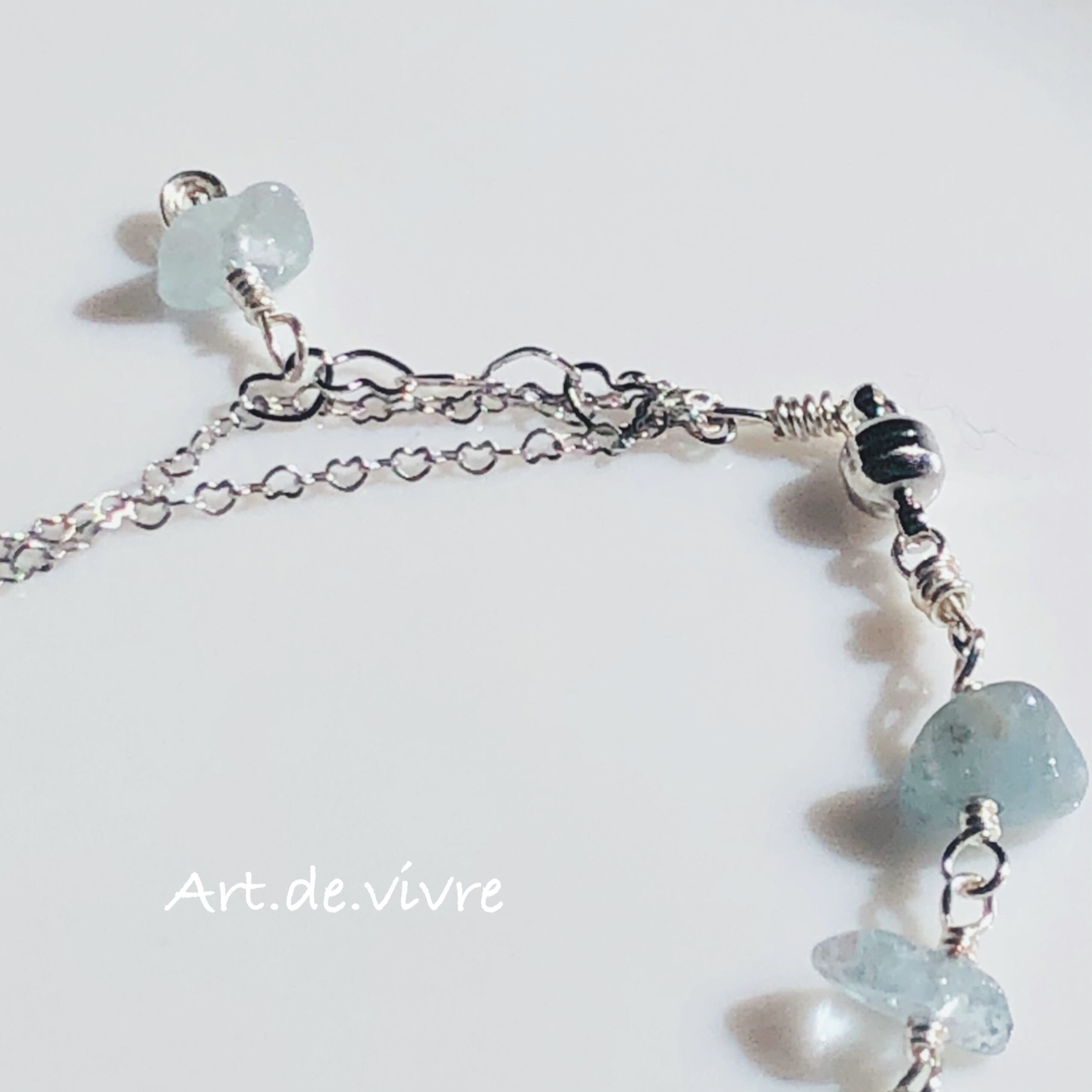 海 空のような爽やかな色合いのぷっくりハートが印象的な「アクアマリン」の天然石とシルバーのダブルチェーンのデザイン天然石ブレスレット。