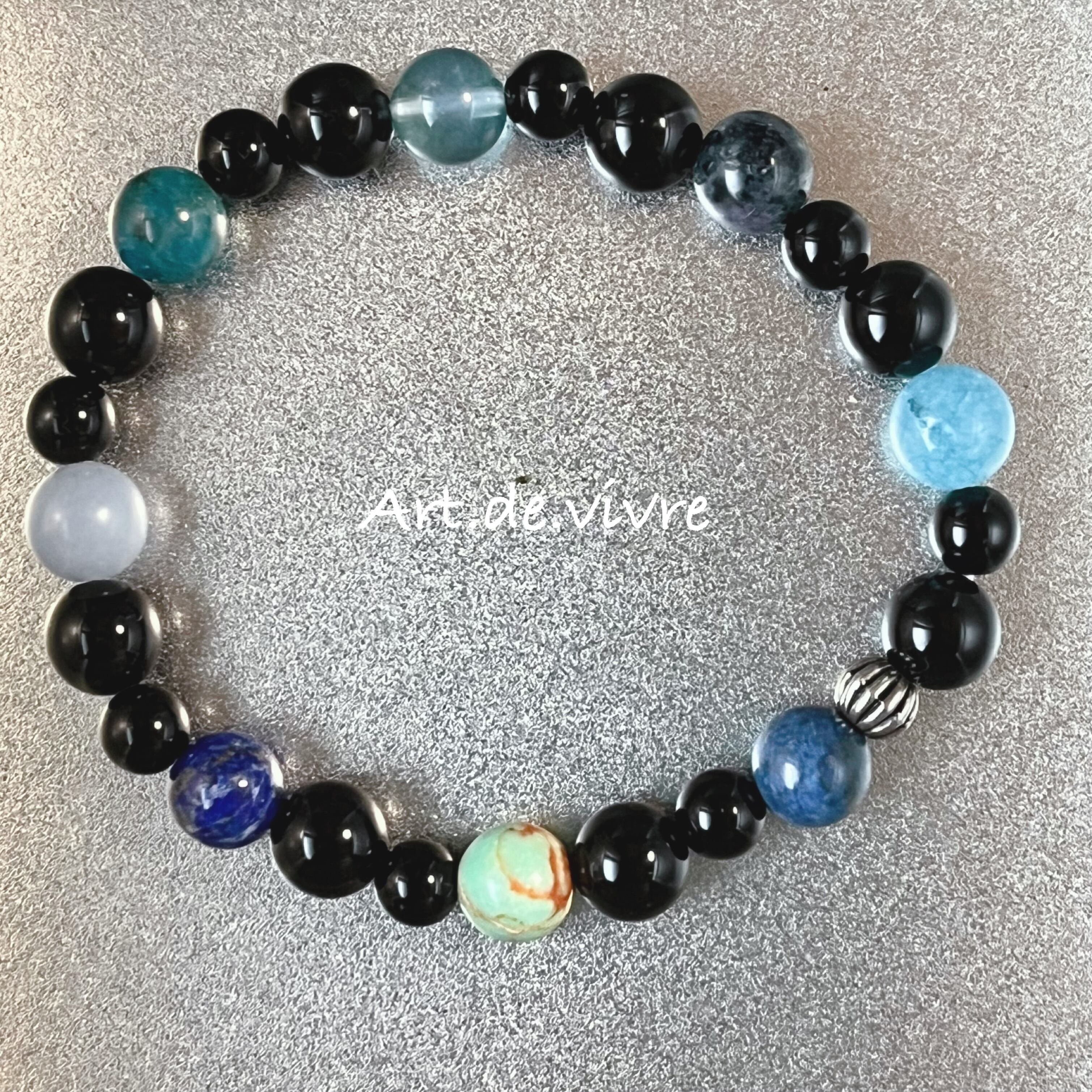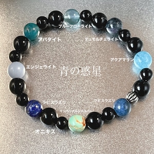 黒のオニキスの宇宙の空間に、ラピスラズリ・アクアマリン・エンジェライト・アパタイト・デュモルチェライト・ブルーフローライト・インペリアルジャスパーの青の惑星が個性的にに光を放っています。
