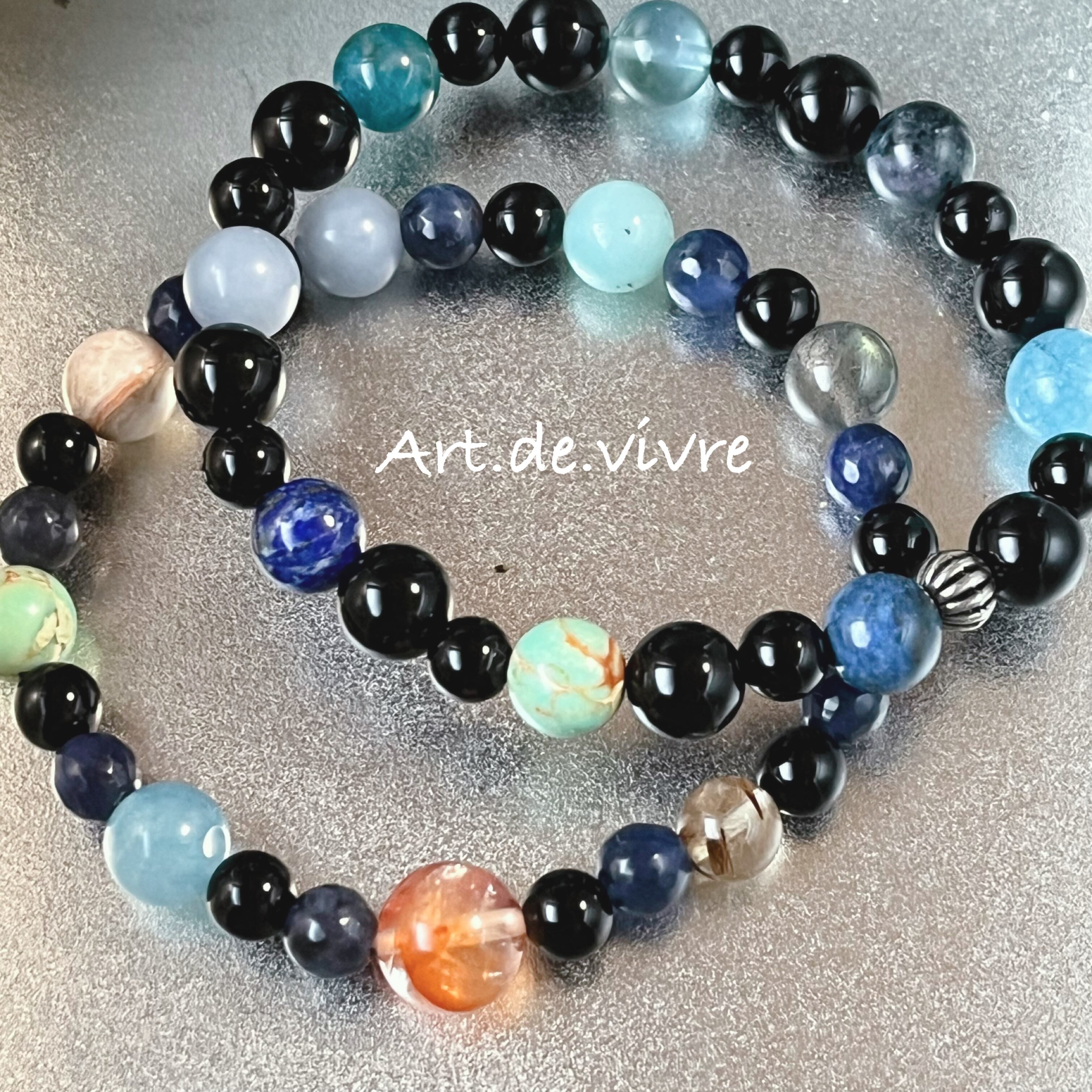ラピスラズリ・アクアマリン・エンジェライト・アパタイト・デュモルチェライト・ブルーフローライト・インペリアルジャスパー・オニキス・オペロンゴム