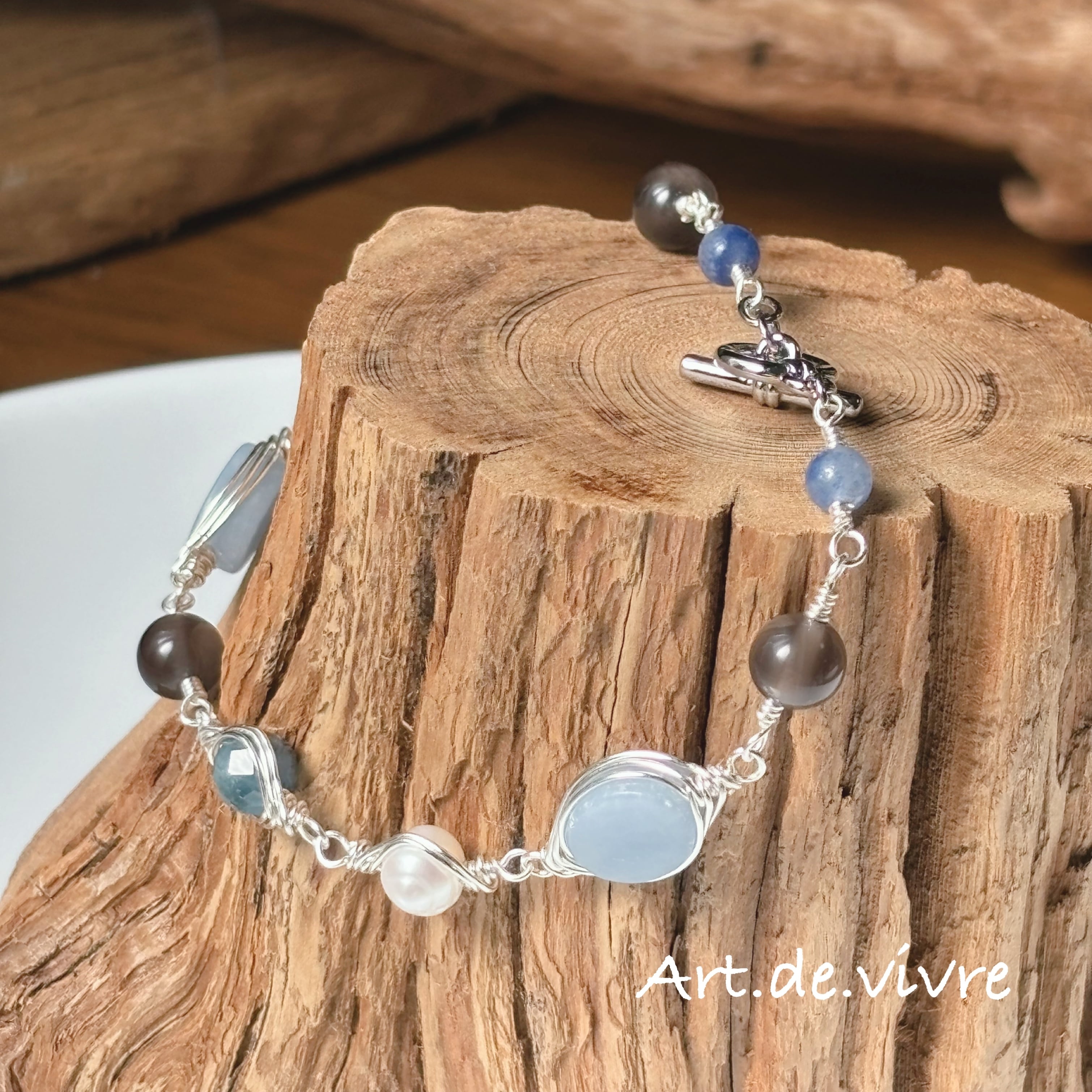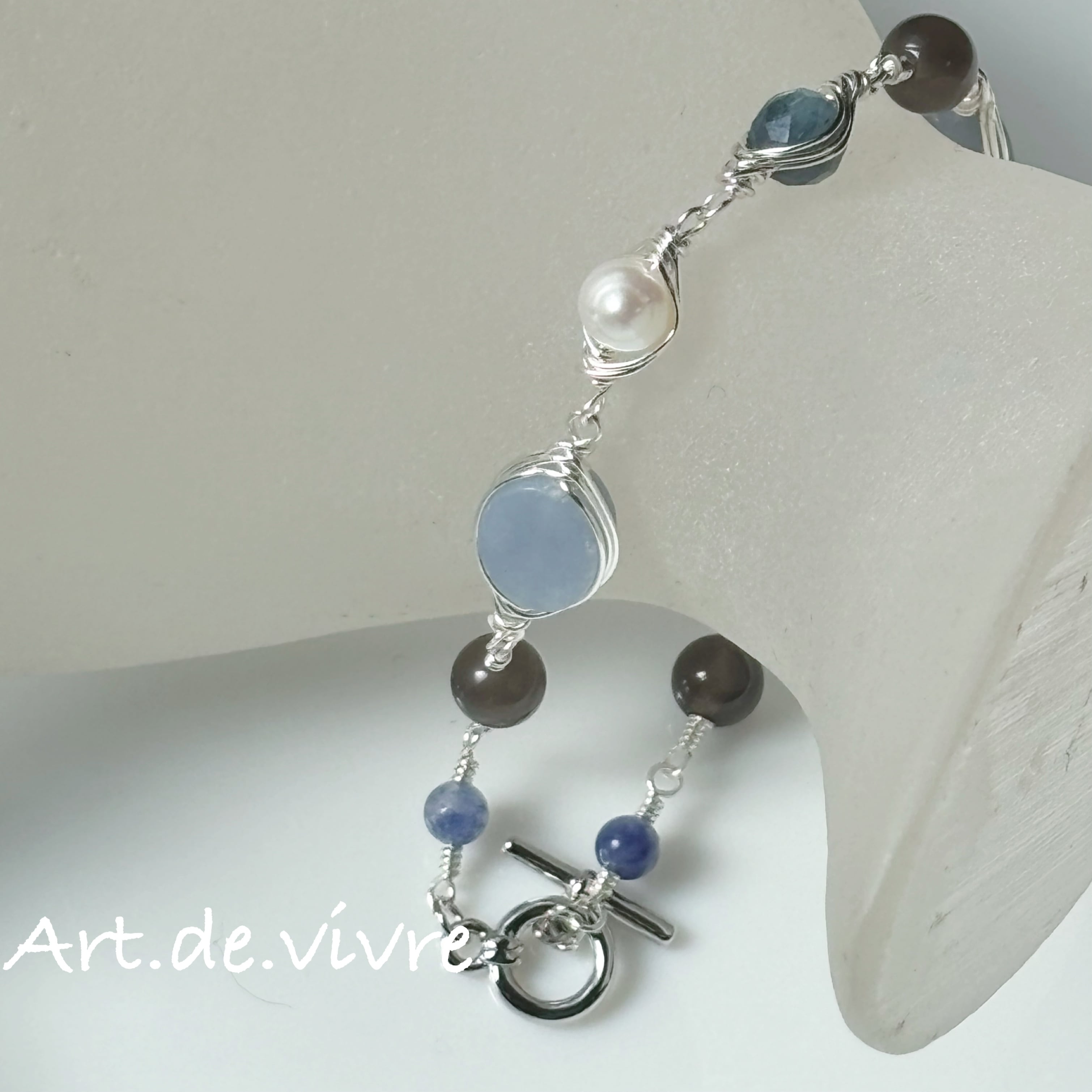 落ち着いた深みのある「ディープブルーアクアマリン」と、爽やかな「エンジェライト」の青のグラデーションが美しく、ブラウンの「アイスオブシディアン」が効果的にグッと全体を引き締めてとてもこなれた色合いです。